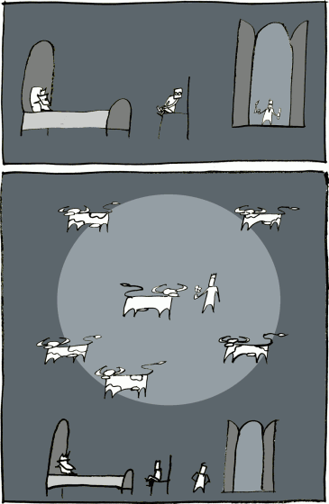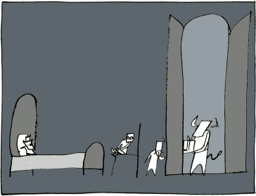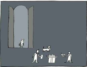 "Before King Jay could take the cow into the maze and escape forever, however, his herdsmen stopped him with news of yet another blessing. Outside of the city walls they found a giant cow idol. King Jay was so honored by this new blessing from the Ocean, he forgot his plan to escape with Daisy. He saw that the Ocean went so far as to place the idol on wheels. His herdsmen could not refuse his order to wheel the cow into the city walls.