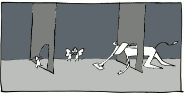 "...ribbit," said the gatekeeper. Rather than lead the Minotaur through the main corridor, however, she instead ran berserk and free around the tiny living areas of the castle reserved for the coupon fairies. The bumping and crunching and stomping of the Minotaur could be heard throughout the castle. At long last, the Minotaur carried the exhausted child into the main hall, where waited Mimbleshaw, Little Eva, Brian, and Spot cloaked in his princely form.