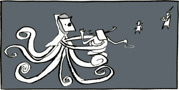 "More than the upset stomach waits for you, monsieur," said Spot. "Engarde. Now I squeeze the breath from you as the giant calamari, no? Ah ha, still too slow to undress from me the pliable obstinacy. Now I am the mouse too small and too fast for you to catch."