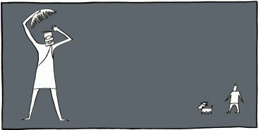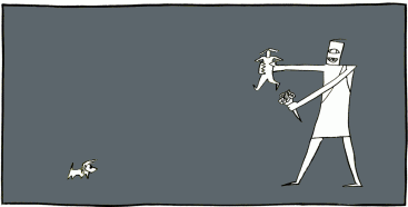 The Cyclops said he fell in love with Princess Ariadne when his relentless eye first gazed upon her. Spot agreed to help the Cyclops court the princess. First they dressed the Cyclops in a sail that washed ashore. Next they combed with a whale bone the Cyclops's rope-like hair. Then they were ready to coach the Cyclops on how to ignite desire for him in Ariadne.
